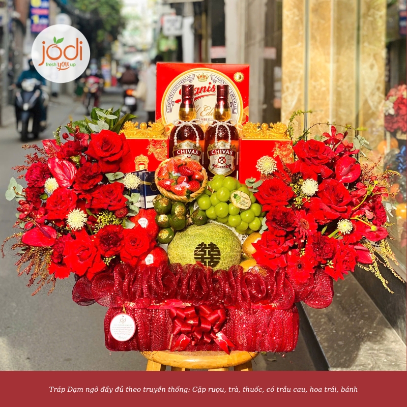 - Tráp Dạm Ngõ: Duy nhất 01 tráp (hoặc một khay lễ/giỏ quà). Vì đây chỉ là buổi gặp mặt nội bộ giữa hai gia đình để thưa chuyện.